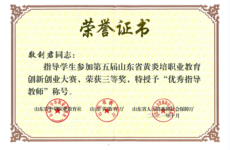 曾获教育部教育管理信息中心“先进工作者、教育部学校规划建设发展中心“2017年应用型人才技能大赛优秀组织个人”、教育部高校毕业生就业协会“先进个人”、”山东省黄炎培职业教育创新创业大赛“优秀指导教师”、 国家级大学生创新创业训练计划项目指导教师等荣誉称号。