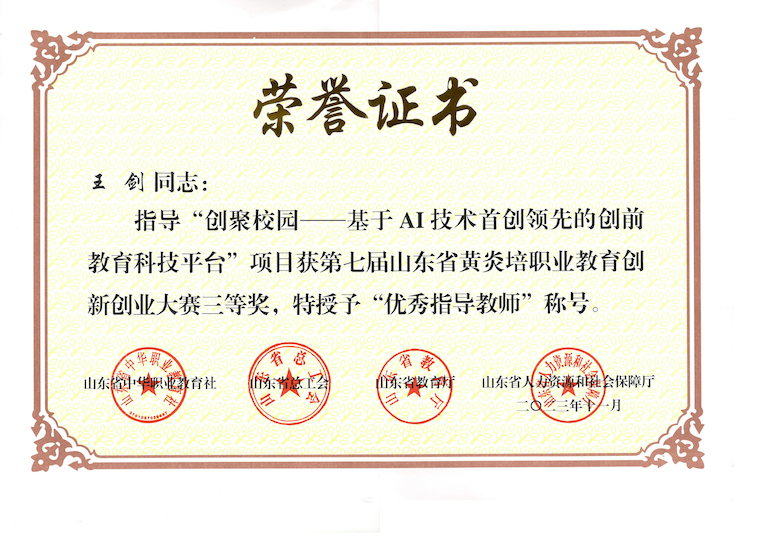 曾获全国电子专业人才设计与技能大赛优秀指导教师、全国大学生语言文字能力大赛优秀指导老师、全国大学生预防艾滋病知识竞赛优秀指导教师、山东省黄炎培职业教育创新创业大赛优秀指导教师、 “互联网+”大学生创新创业大赛省赛金奖指导教师,国家级大学生创新创业训练计划项目指导教师。