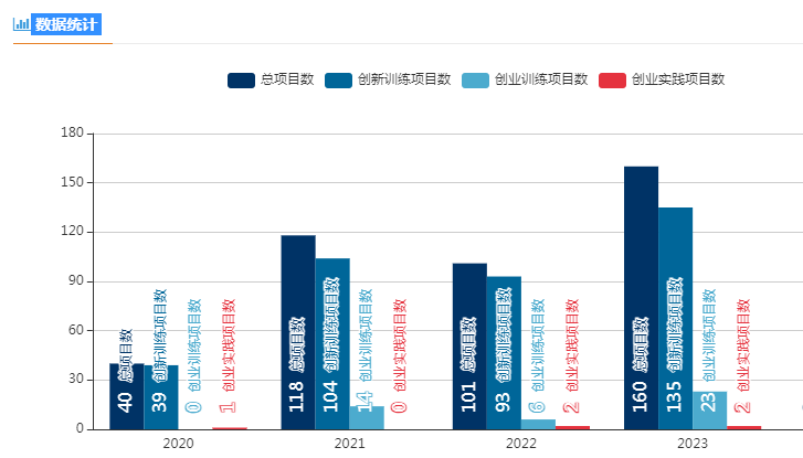 2019年省级以上项目27项、2020年省级以上立项40项、2021年省级以上立项118项、2022年省级以上立项101项、2023年省级以上立项160项。各类项目数量,如图所示: