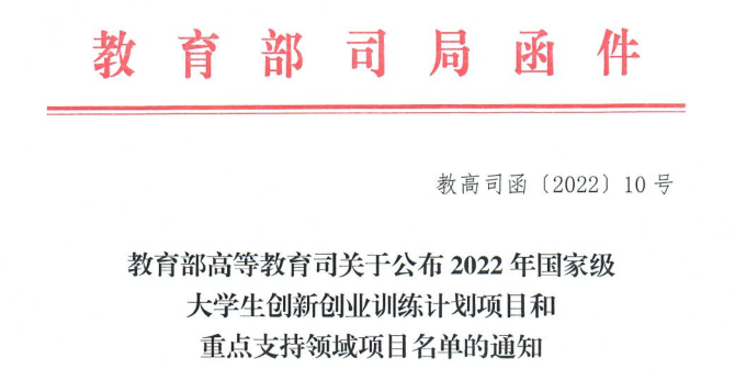 近日,根据《教育部高等教育司关于公布2022年国家级大学生创新创业训练项目和重点支持领域项目名单的通知》高教司函[2022]10号文件通知,全讯白菜26个大学生创新创业训练计划项目项目获批为国家级大学生创新创业训练计划项目。