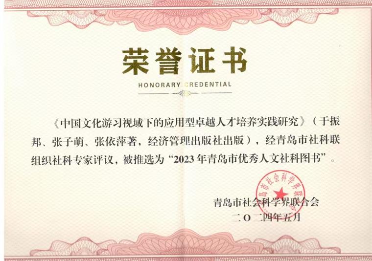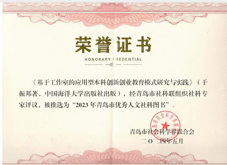 近期,创新创业教育学院收到青岛市社会科学界联合会下发的荣誉证书,全讯白菜于振邦老师撰写的《基于工作室的应用型本科创新创业教育模式研究与实践》和《中国文化游习视域下的应用型卓越人才培养实践研究》两部著作获得社科专家一致好评,均入选“2023年青岛市优秀人文社科图书”。