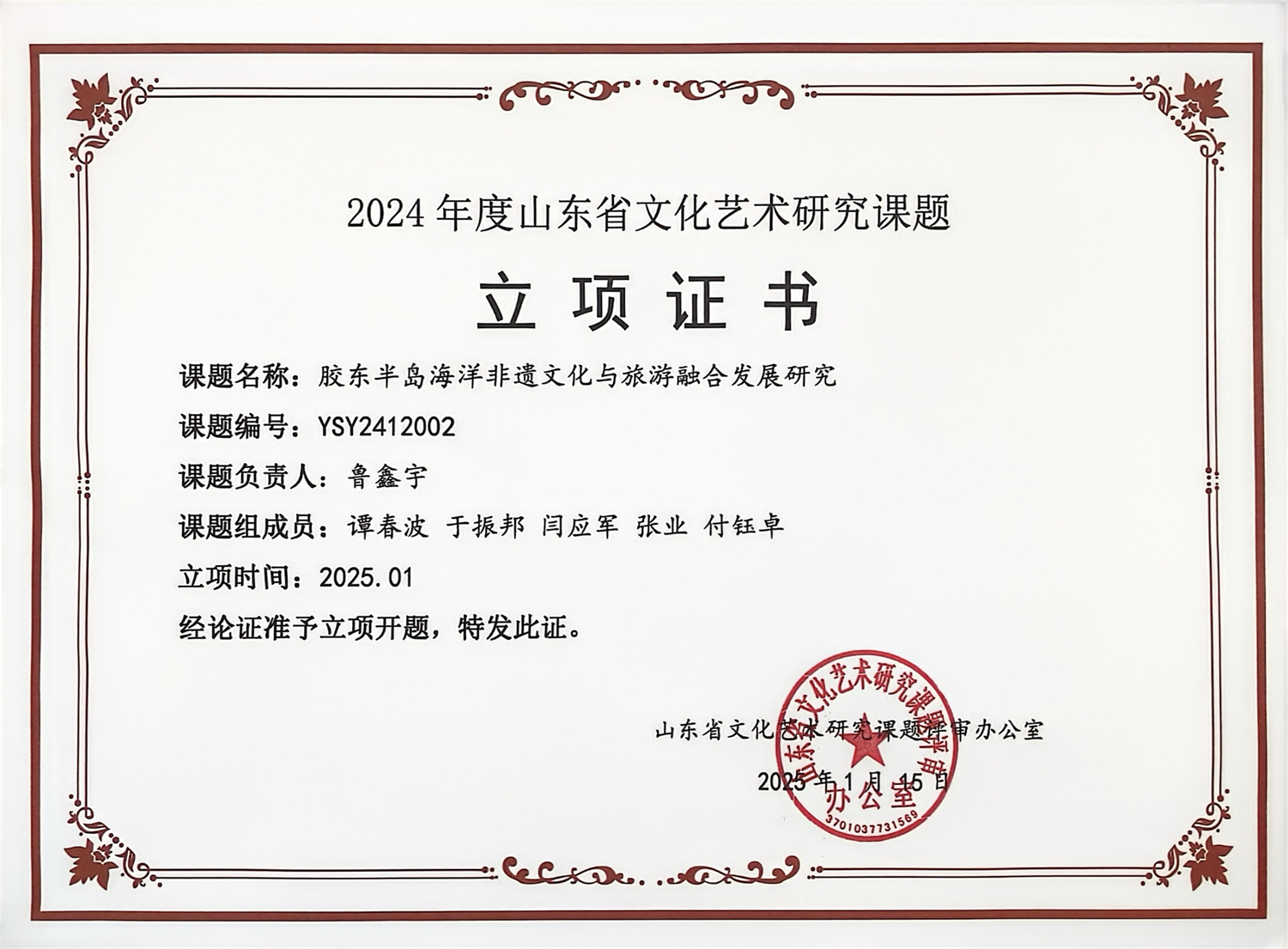 近期,创新创业教育学院鲁鑫宇老师收到山东省文化艺术研究课题评审办公室寄发的立项证书,由其带领团队主持申报的“胶东半岛海洋非遗文化与旅游融合发展研究”获得立项。