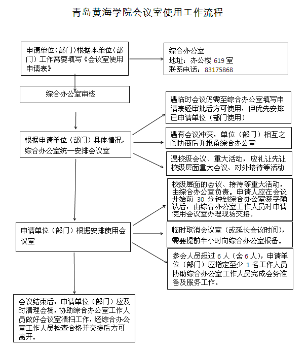 (五)校级层面会议、接待等活动由综合办公室负责承办;各单位(部门)承办的会议、接待等活动,申请人应在会议开始前30分钟到综合办公室签字确认后,由综合办公室工作人员对申请使用会议室办理现场交接。