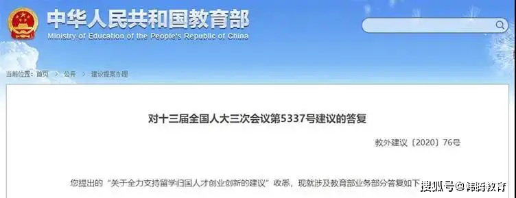 教育部在《对十三届全国人大三次会议第5337号建议的答复》中指出:教育部坚持以“支持留学、鼓励回国、来去自由、发挥作用”的新时代留学工作方针为指引,积极应对新冠肺炎疫情影响,不断创新服务模式,提高服务水平和质量,支持留学人员回国服务,鼓励他们成为大众创业、万众创新的生力军。