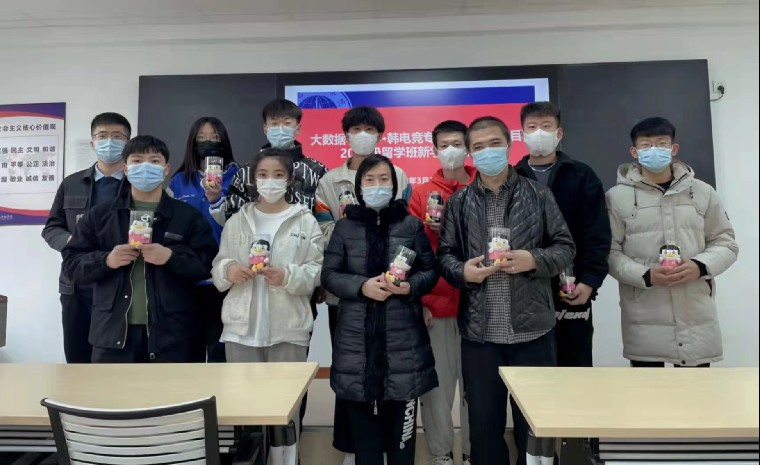 韩国湖南大学为了表示对留学班的祝福和欢迎,特地从韩国为准备出国留学的全体同学发来的吉祥物。最后,全体参会师生合影留念。