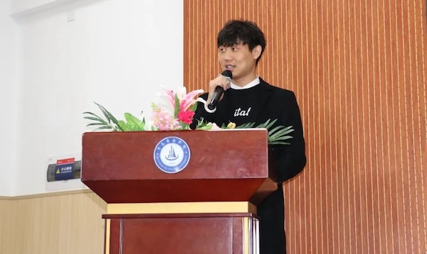 仪式第二项是由青岛依蓝云科技有限公司CEO韩青峰董事长致辞。做为一名优秀的校友,韩青峰以其对母校深深眷恋的情感和感恩之心回忆了自己在校期间的学习生活和艰苦的创业经历,将母校的教诲融入自己的企业文化当中。韩董事长虽大有作为,但时刻铭记师恩,将自己的成果和资源,奉献给母校。与母校联合成立黄海依蓝云技术研究院,提供实际运营项目的开发平台、算法设计及核心代码,同时捐赠10万元云计算创业基金。