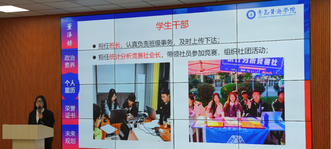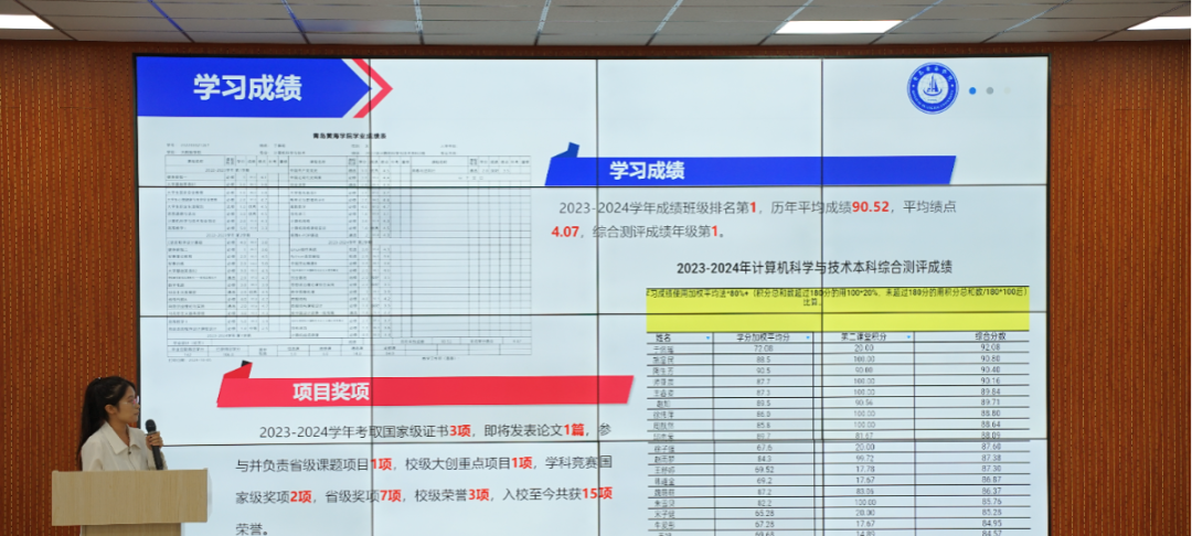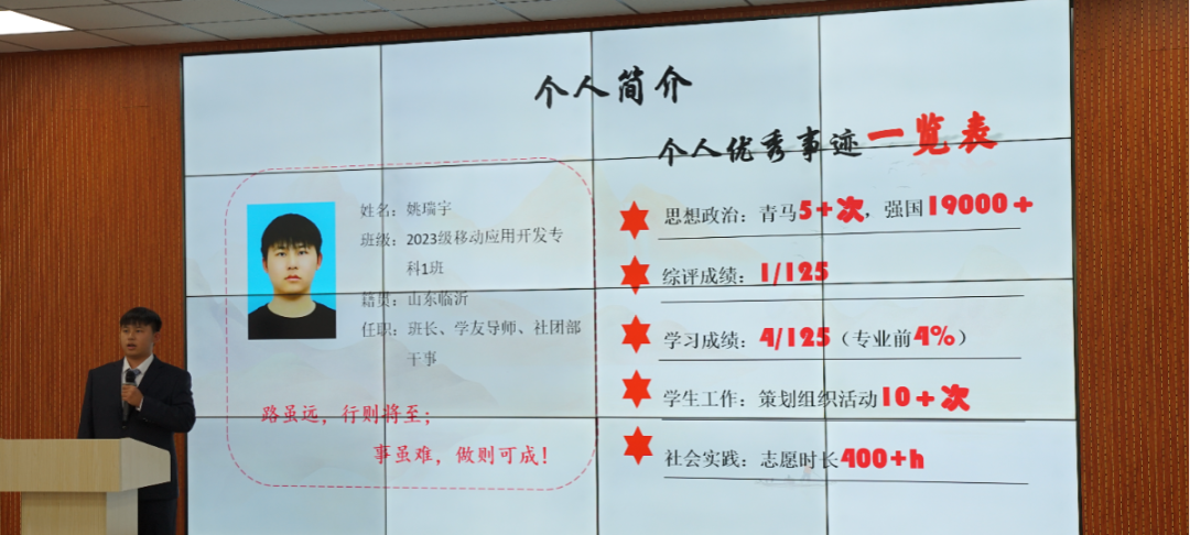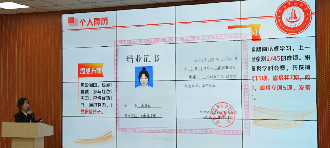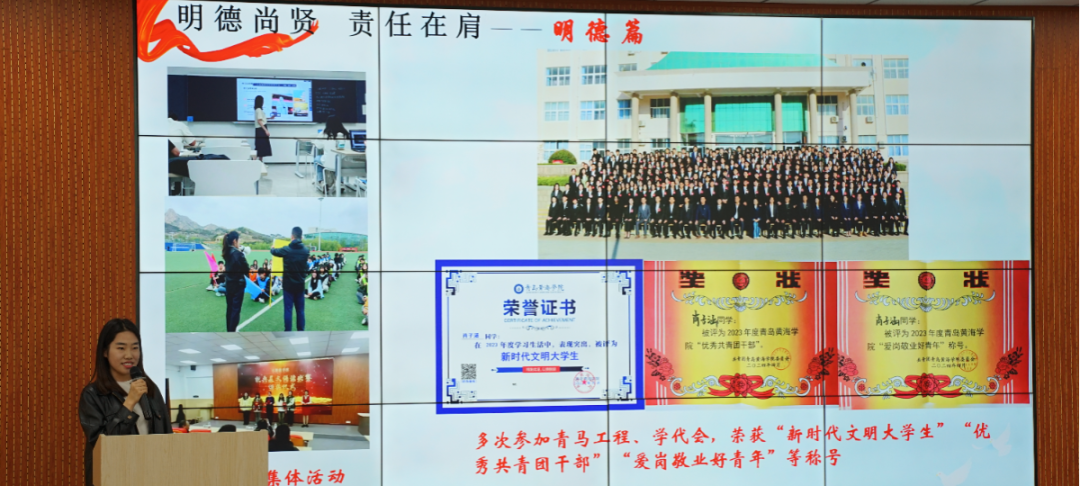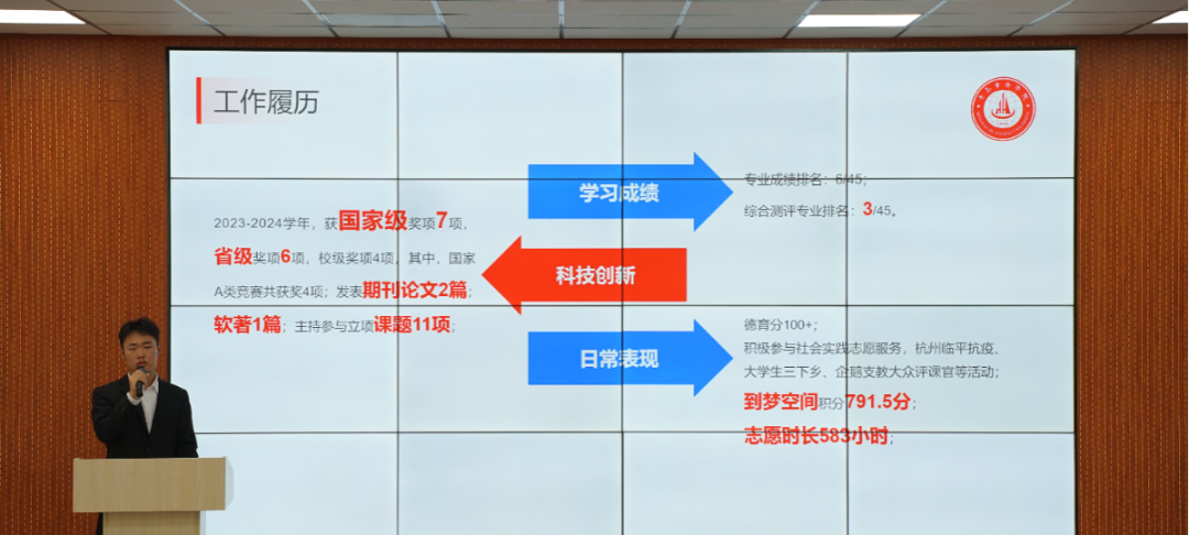 候选人们逐一上台,讲述了他们在2023-2024学年度思想建设、学业成就、科研竞赛及社会实践等方面的丰硕成果。他们不仅展示了在德智体美劳各方面的卓越风采,更将大学生特有的自信与活力展现得淋漓尽致,每一个细节都透露出他们对优秀的不懈追求和对自我的全面塑造。