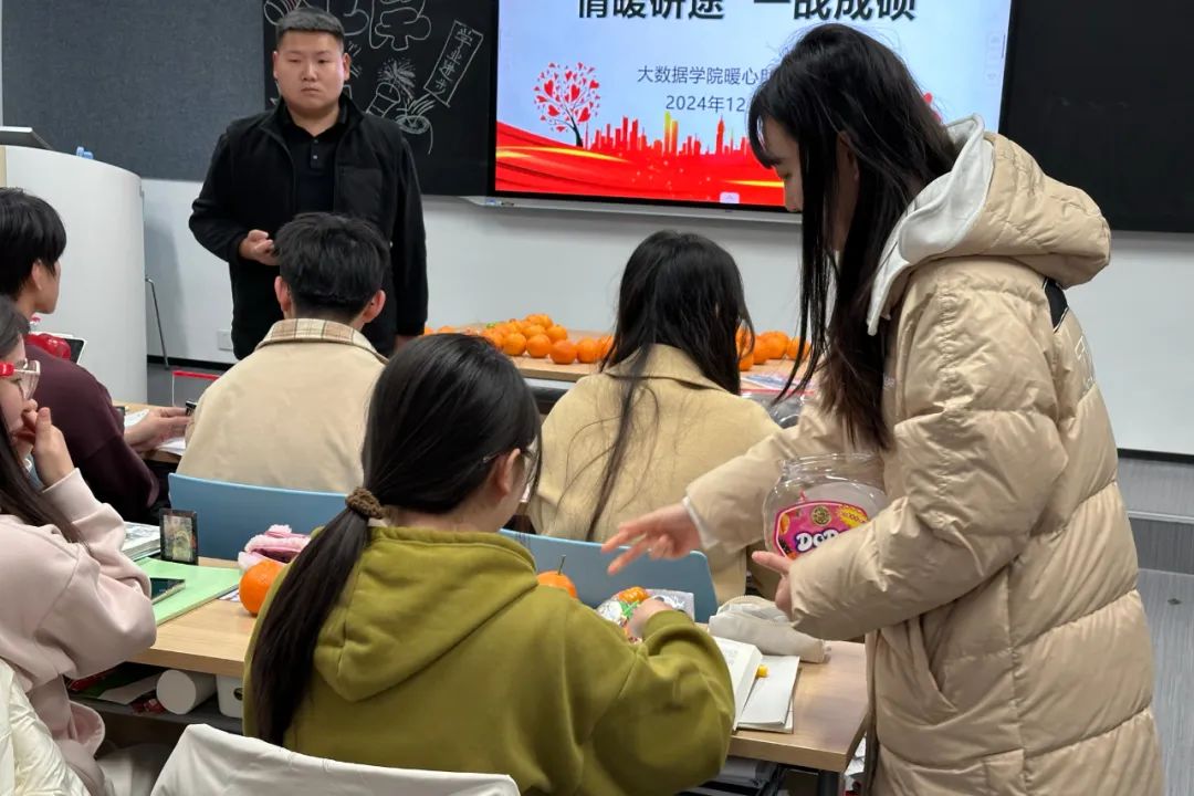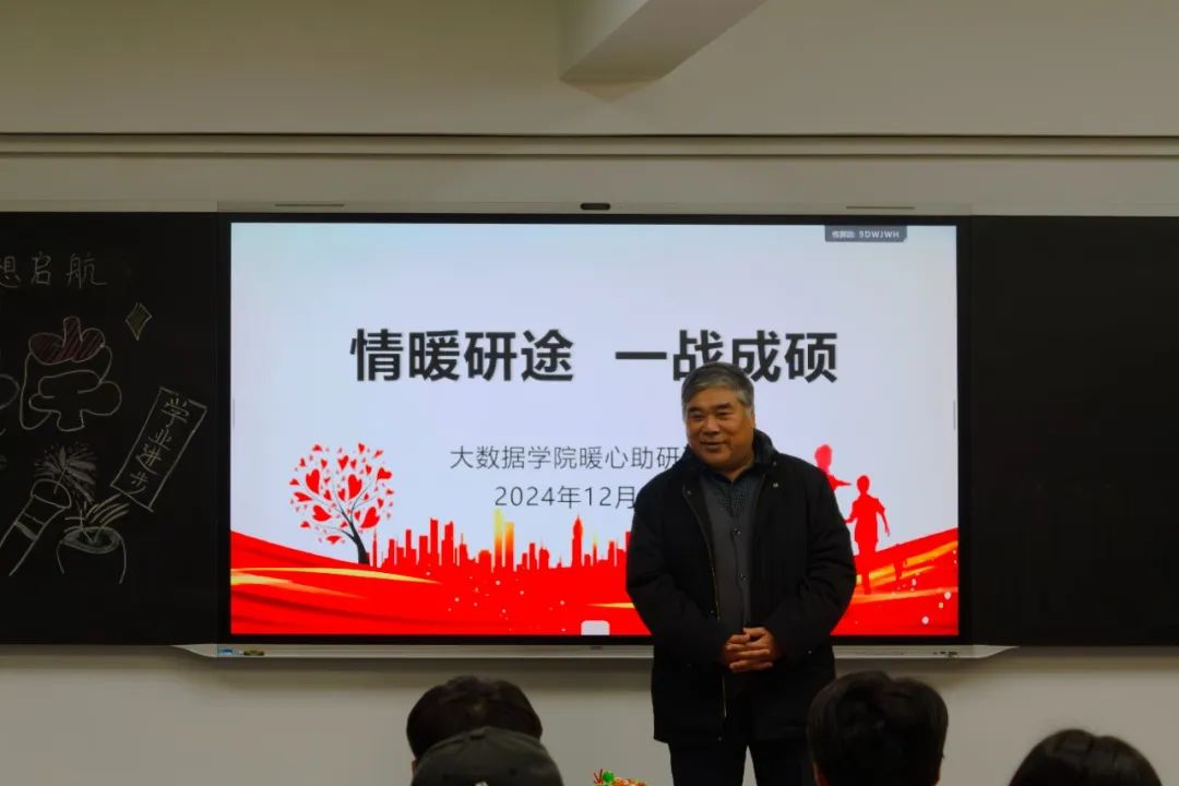 寒窗书剑十年苦,今日向阳花正开。2025年全国硕士研究生招生考试即将来临,考研学子也进入了最后冲刺阶段。为帮助大数据学院2025届考研学子坚定备考信心、缓解备考压力,12月18日,大数据学院院长郑永果、副院长孙守强、院长助理李宗锋及全体辅导员在知新楼107教室开展“情暖研途,一战成硕”温暖同行活动,慰问考研学生,并为备考学子送去精心准备的考研加油包,全面助力考研学子“研”路生花。