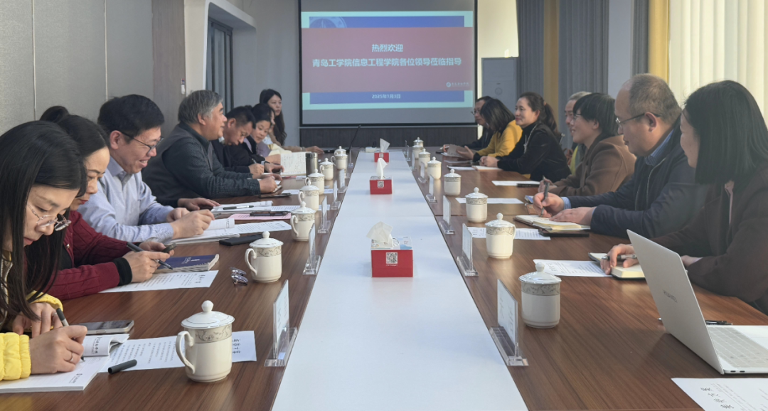 2025年1月3日,青岛工学院信息工程学院副院长房正华一行8人来我院考察调研。双方就本科教学审核评估工作准备重点与主要措施、教学质量保障体系方面的措施与效果、大学生创新创业教学的措施、科研及产学研合作等进行交流。大数据学院院长郑永果、副院长孙守强、院长助理李宗锋、计算机科学与技术系主任薛峰会、人工智能系主任王晓辉、物联网工程系主任李翠、实验教学服务中心副主任孙丽等参会交流。