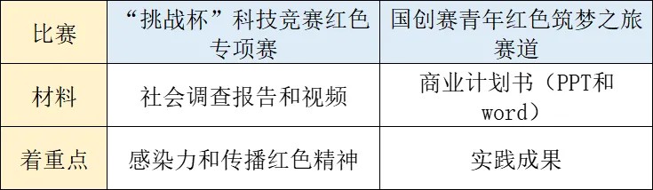 红色专项赛和青年红色筑梦之旅赛道。“挑战杯”红色专项赛(红色专项活动)是写社会调查报告(word)并制作视频,重点在于感染力和传播力。而国创赛青年红色筑梦之旅赛道主要是制作商业计划书(PPT和word),用商业或者公益的力量助力乡村振兴和城乡社区经济发展,对实践成果、落地案例的要求很高。近两年确实有不少项目两个比赛同时参加,需要把握对比赛材料的不同要求,前者重感染和传播红色精神,后者主要重实践成果。