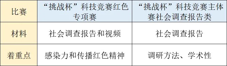 “挑战杯”科技竞赛红色专项赛和主体赛社会调查报告。主体赛社会调查报告对调研方法、学术性的要求较高,如果有论文发表是非常好的助力。而红色专项赛评审中视频占了55%的分数,调查报告只占了45%,可以看出该赛道对感染力、传播力要求较高,在制作参赛材料的时候一定要把“红色精神”放在首位,要传播的是“红色精神”,而不是宣传参赛团队。此外,红色专项赛聚焦在“红色精神”这一个主题上,主体赛社会调查报告可以自由选题。