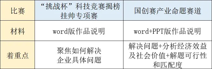 揭榜挂帅专项赛和产业命题赛道。揭榜挂帅专项赛是两年一届的“挑战杯”科技竞赛下设的一项专项赛,产业命题赛道则属于中国国际大学生创新大赛(原“互联网+”大赛)。从性质上看,两项比赛都属于企业发榜、团队答题,甚至有些发榜单位都是一样的。从参赛材料上看,揭榜挂帅专项赛网评要求提交word版作品说明,材料聚焦在解决企业具体问题上,类似于课题结项书。而产业命题赛道除word版作品说明外还要求提交PPT版作品介绍作为主要评审材料,在材料制作的逻辑和结构上有很大不同,产业命题赛道要站在企业的视角上分析问题的解决给企业带来的经济效益、社会价值等内容,同时还要从教育、团队、实现等多维度论述可行性。