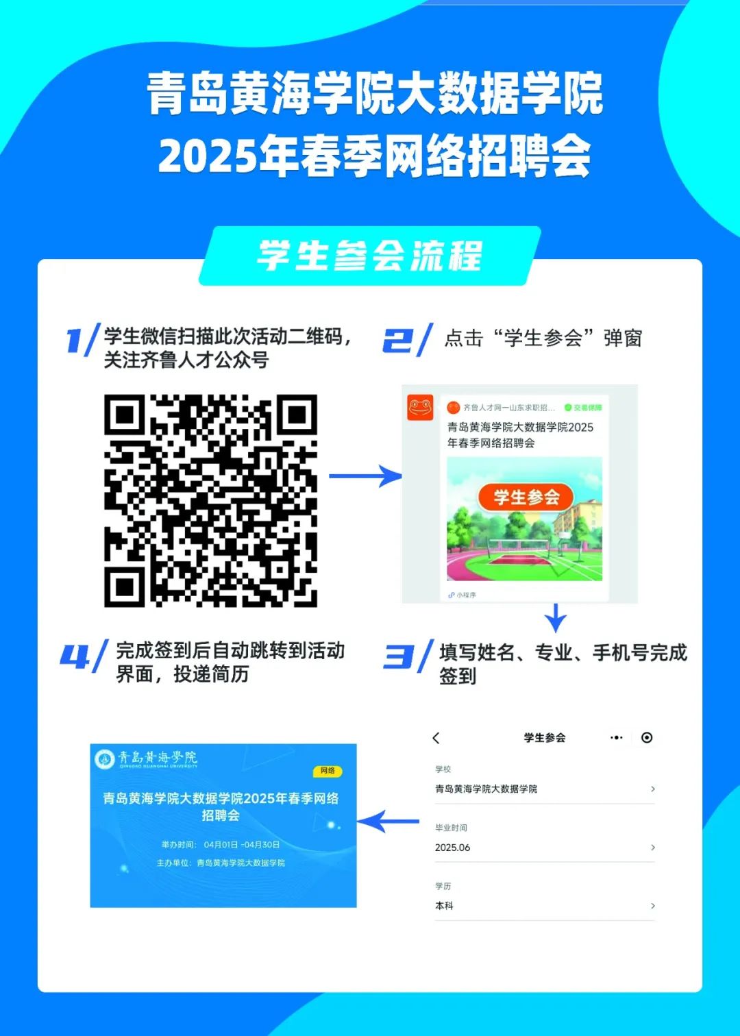 微信扫码后关注“齐鲁人才”公众号,点击“学生参会”,输入姓名,专业,手机号等基本信息后,即可报名参会。