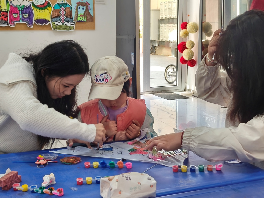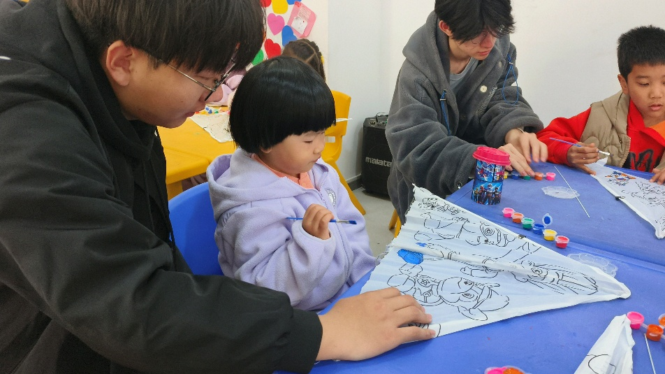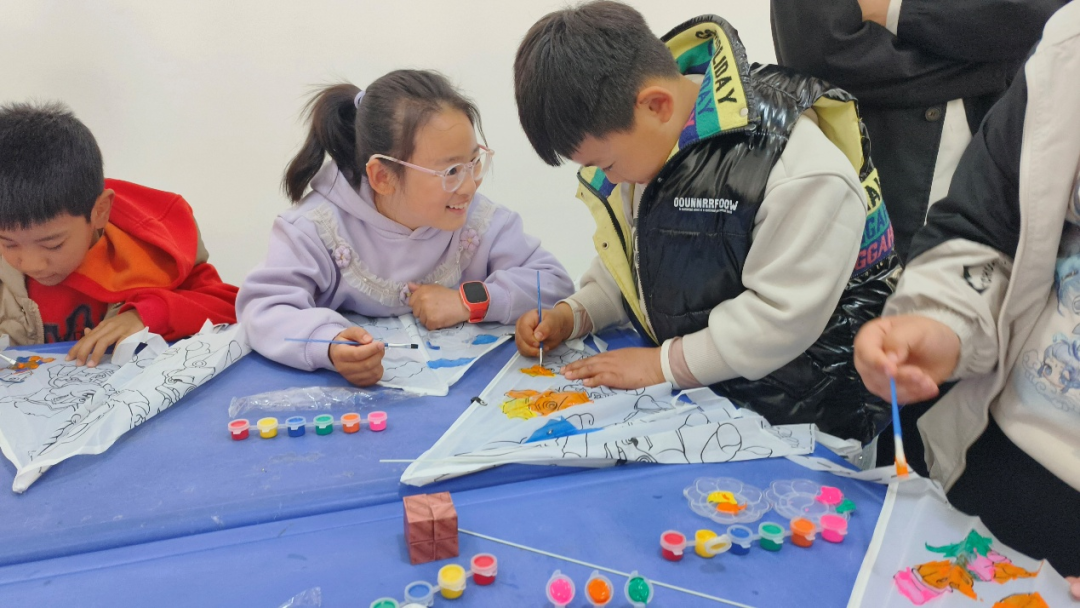 志愿者为每位孩子分发空白风筝和环保颜料,鼓励大家自由创作。小朋友们化身"小小艺术家",有的画出七彩蝴蝶,有的涂出卡通人物,还有的写上对未来的祝福。志愿者也参与其中,协助调色、勾边,协作的温馨场景随处可见。一只只独一无二的风筝,承载着孩子们的奇思妙想在阳光下熠熠生辉。