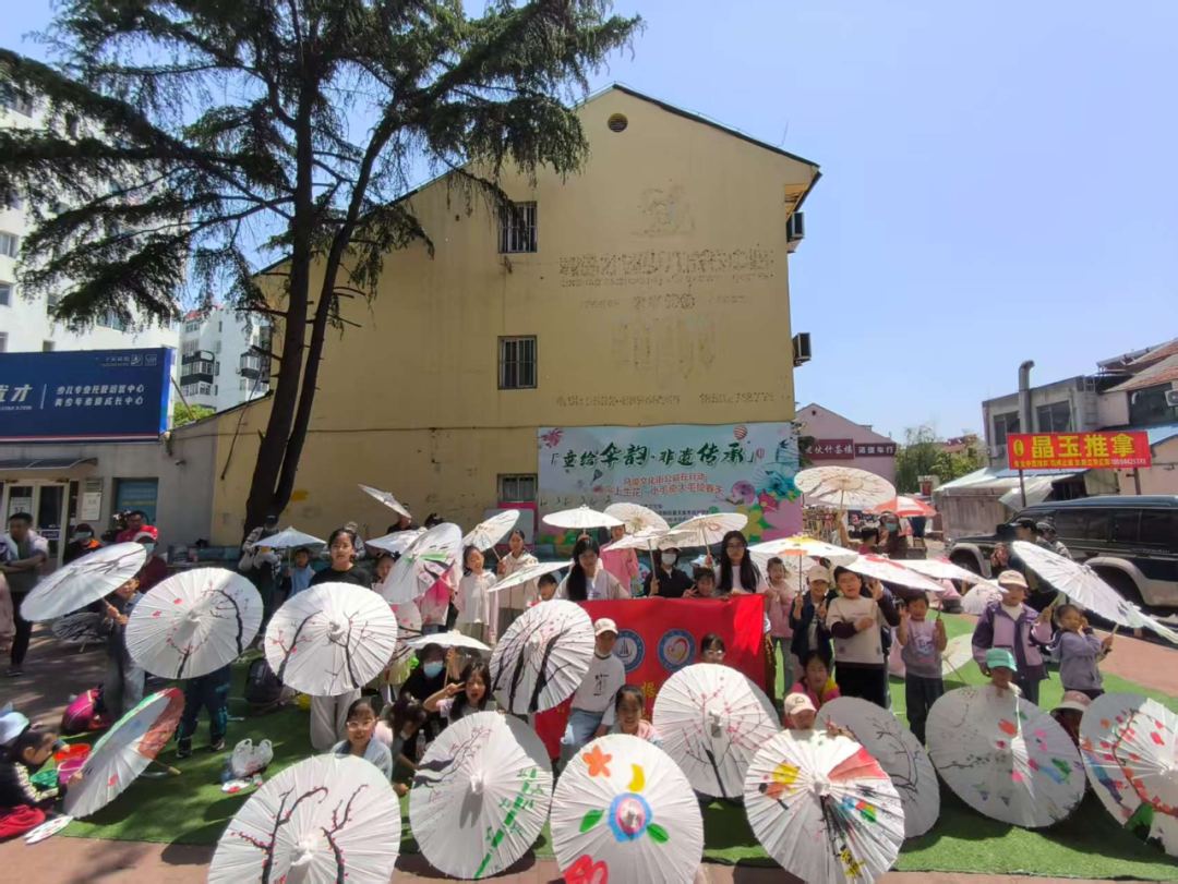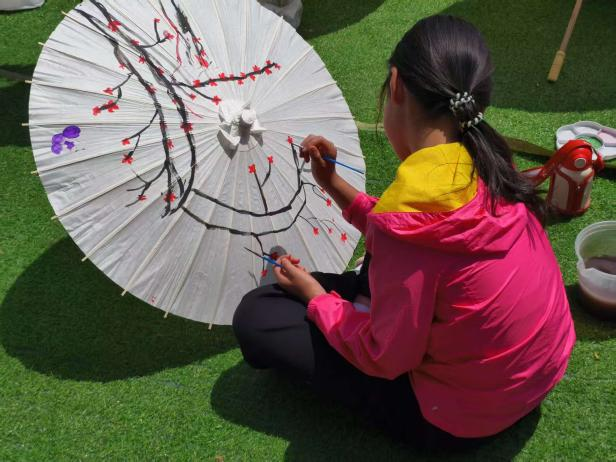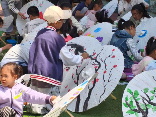 当一幅幅作品完成时,素白的纸伞已变成色彩斑斓的“非遗载体”。孩子们高举纸伞列队展示,伞面上的山水、花鸟、萌宠与马濠公园的绿树繁花相映成趣,仿佛一场流动的非遗艺术展。