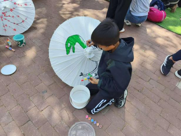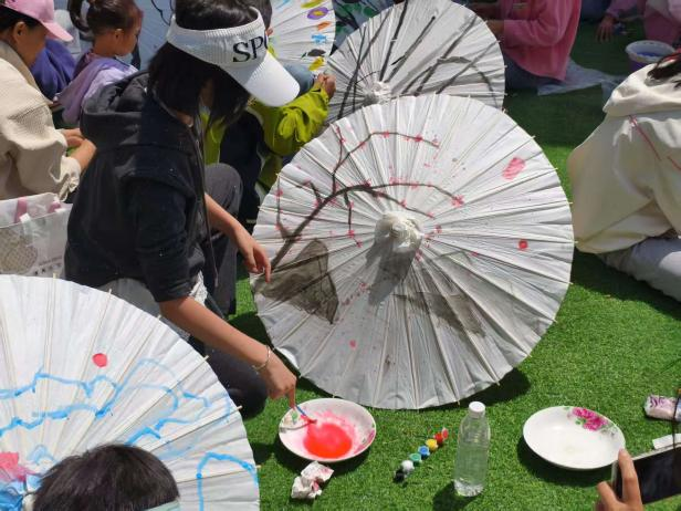接着,由志愿者们发放完材料后,小朋友们围坐在草坪上,时而凝视油纸伞图案参考图,时而在调色盘上调配色彩,很快投入到创作中。有的孩子模仿传统纹样,用浓淡不一的墨色描绘出远山近水,再以朱红点缀舟上行人;有的孩子则将非遗元素与卡通形象结合,在伞面画中设计了卡通动画等创意形象。绘画过程中,老师与志愿者悉心指导,提醒孩子们注意传统绘画中的“留白”技巧,家长们也在一旁协助调色,共同感受非遗艺术融入现代生活的独特魅力。
