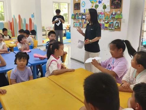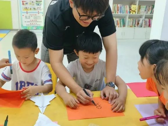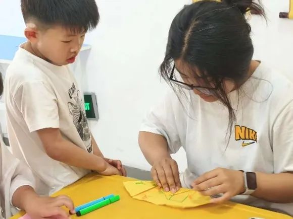 纸飞机折叠:在志愿者指导下,学生将卡纸按步骤折成纸飞机。部分学生还在机翼上画上笑脸图案,寓意 “烦恼飞走,快乐留下”。