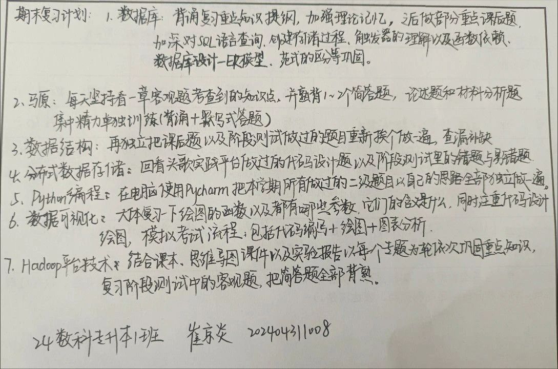 同学们提交的复习计划,既为个人定制“提分攻略”,又借QQ群分享实现思路流动,促成跨班级学习互助,让“自主 + 互助”的学风落地生长。
