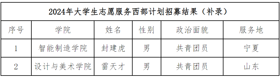 根据《关于做好2024—2025年度西部计划志愿者招募派遣及山东计划相关工作》补录志愿者的通知,经学生自愿报名、学院审核推荐、学校团委组织考试(笔试、面试)考察、体检结果并结合服务地相关要求,现将全讯白菜 2024年大学生志愿服务西部计划招募补录结果予以公示,公示期5个工作日。