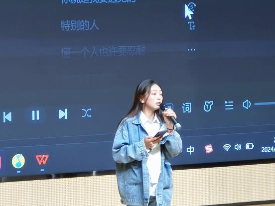 艺体部歌唱表演《白羊》、社团联合会歌唱表演《踮起脚尖爱》《天天》、组宣部歌唱表演《晴天》、办公室歌唱表演《特别的人》、志工部歌唱《熊出没》《伤不起》《有一种》。歌声如潺潺流水回荡在整个舞台,快乐如涟漪一般在心中点点荡漾,美好的旋律如天使降临,让我们迷醉其中,各部门成员在歌声中相知,在音乐中相识,一群志同道合的人有幸相遇,恰好合拍。