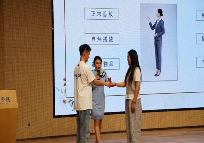 王芊芊老师强调大学生的个人形象塑造,根据场合选择适宜的服装,如在正式场合(如开学典礼、毕业典礼、学术讲座等)应穿着整洁大方,不宜过于随意。日常生活中,衣着得体,符合大学生的身份形象。注意个人卫生,保持良好的仪容仪表,展现健康、阳光的精神风貌。王芊芊老师通过随机挑选学生上台进行站姿、坐姿、走姿教学,以独特且富有魅力的方式,将礼仪知识以生动有趣的形式呈现给同学们。