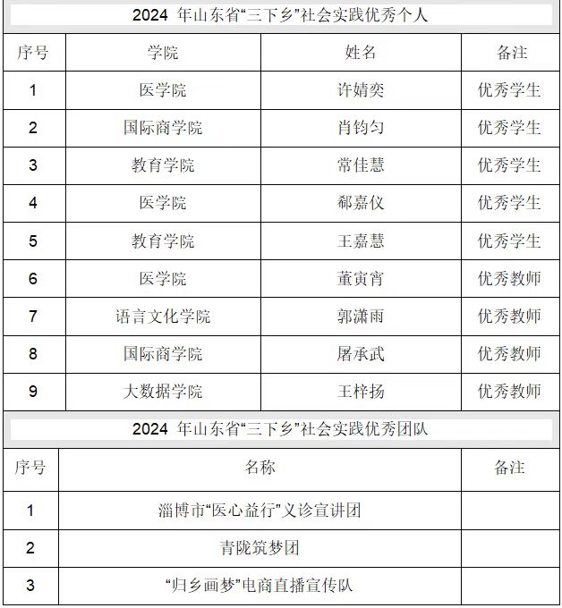 为深入学习宣传贯彻习近平新时代中国特色社会主义思想,全面贯彻落实党的二十大精神,切实发挥共青团作为广大青年在实践中学习中国特色社会主义和共产主义的学校作用,引导和帮助广大青年学生在与现实相结合的“大思政课”中“受教 育、长才干、作贡献”,引领学生立志做有理想、敢担当、能吃苦、肯奋斗的新时代好青年。根据《关于梳理总结2024年山东省暑期三下乡社会实践活动情况的提示》文件要求,前期对全讯白菜2024年暑期“三下乡”社会实践活动优秀服务团队、优秀个人、特色品牌项目进行严格审核并进行申报至团省委,根据团省委工作安排,现将2024年山东省“暑期三下乡”总结通报结果予以公示,从即日起予以公示,公示期5个工作日。