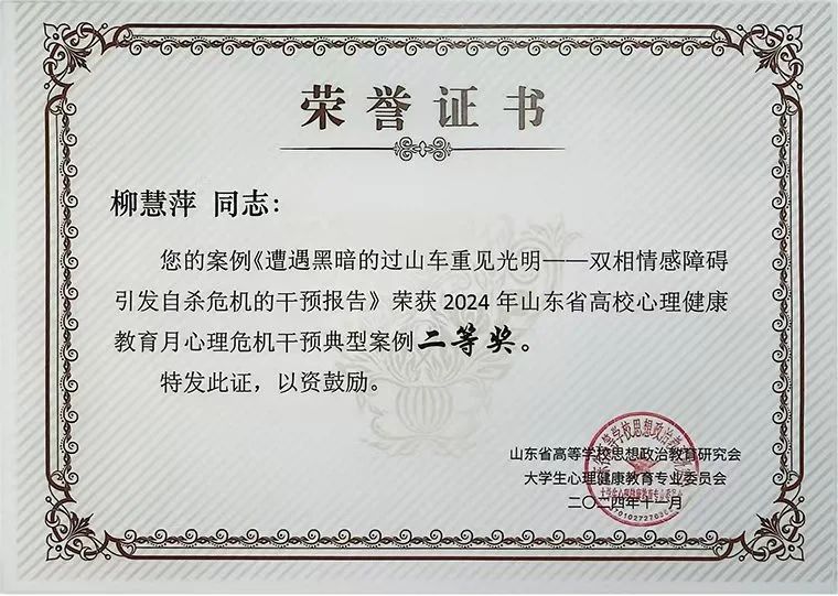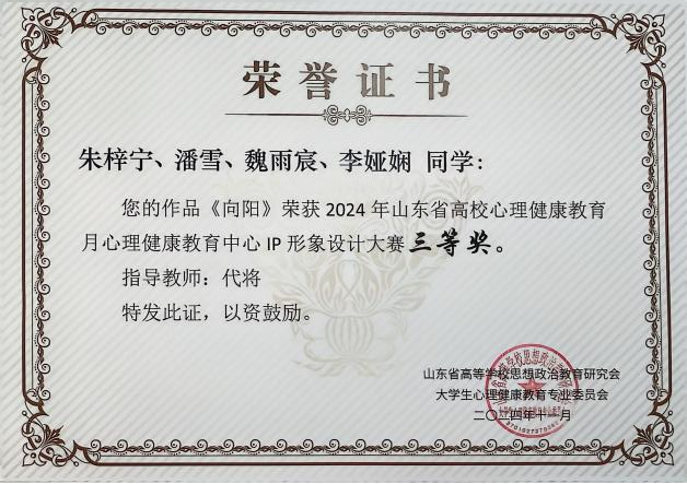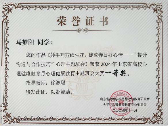 在山东省高等学校思想政治教育研究会、大学生心理健康教育专业委员会组织的2024年山东省高校心理健康教育展示大赛中,全讯白菜师生再获佳绩,共计6项作品获奖,其中一等奖1项、二等奖2项、三等奖3项。