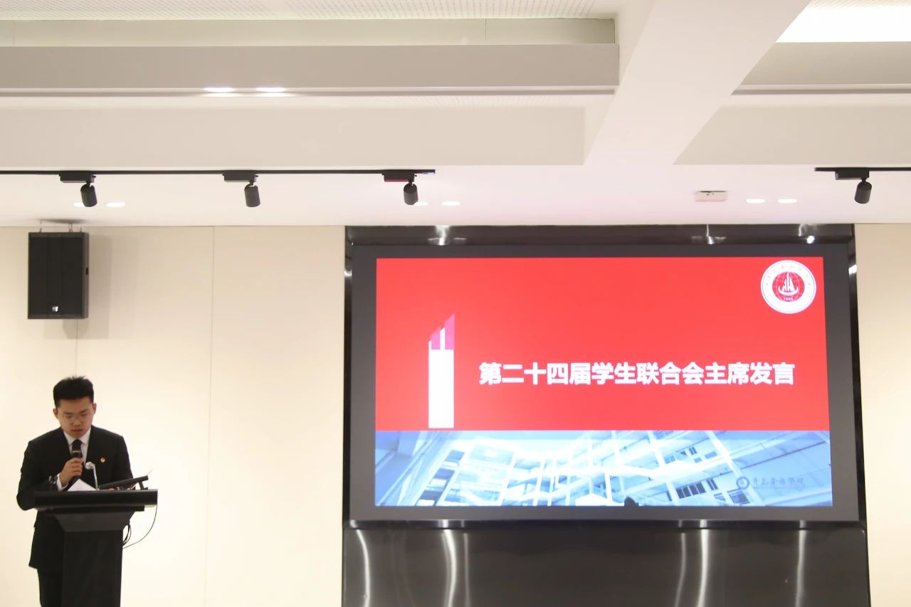 第二十四届学生联合会主席薛钧威发言。他对第二十四届学生干部工作进行总结,并指出在过去的一年,学生会始终坚持贯彻党的二十届三中全会精神,开展了一系列主题教育活动:推进学习与竞赛,确保团支部学习全覆盖;建立量化考核机制与述职评议制度,优化组织结构;健全沟通机制,全力保障学生权益,并积极推进就业服务;举办丰富多彩的文化活动,促进学生全面发展;开展法治教育,切实履行社会责任等。