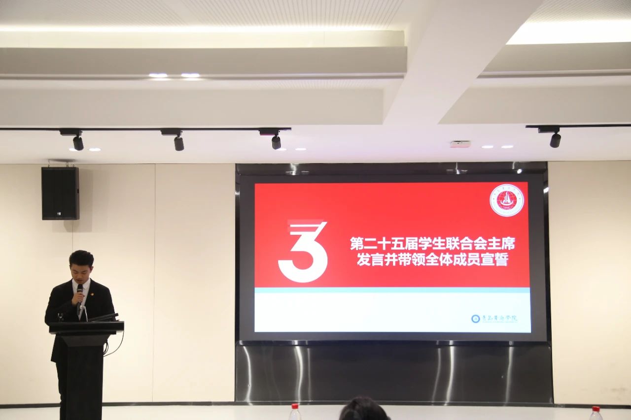第二十五届学生联合会主席张城玮发言。他强调,学生会在校团委引领下自主运作,竭诚服务同学,并提出以下工作设想:加强思想引领,强化基础,完善章程优化流程;丰富第二课堂,打造精品社团,交流经验激发活动新活力;深化服务意识,成员化身志愿者,全心投入服务同学,广纳意见解决同学们的切实问题。
