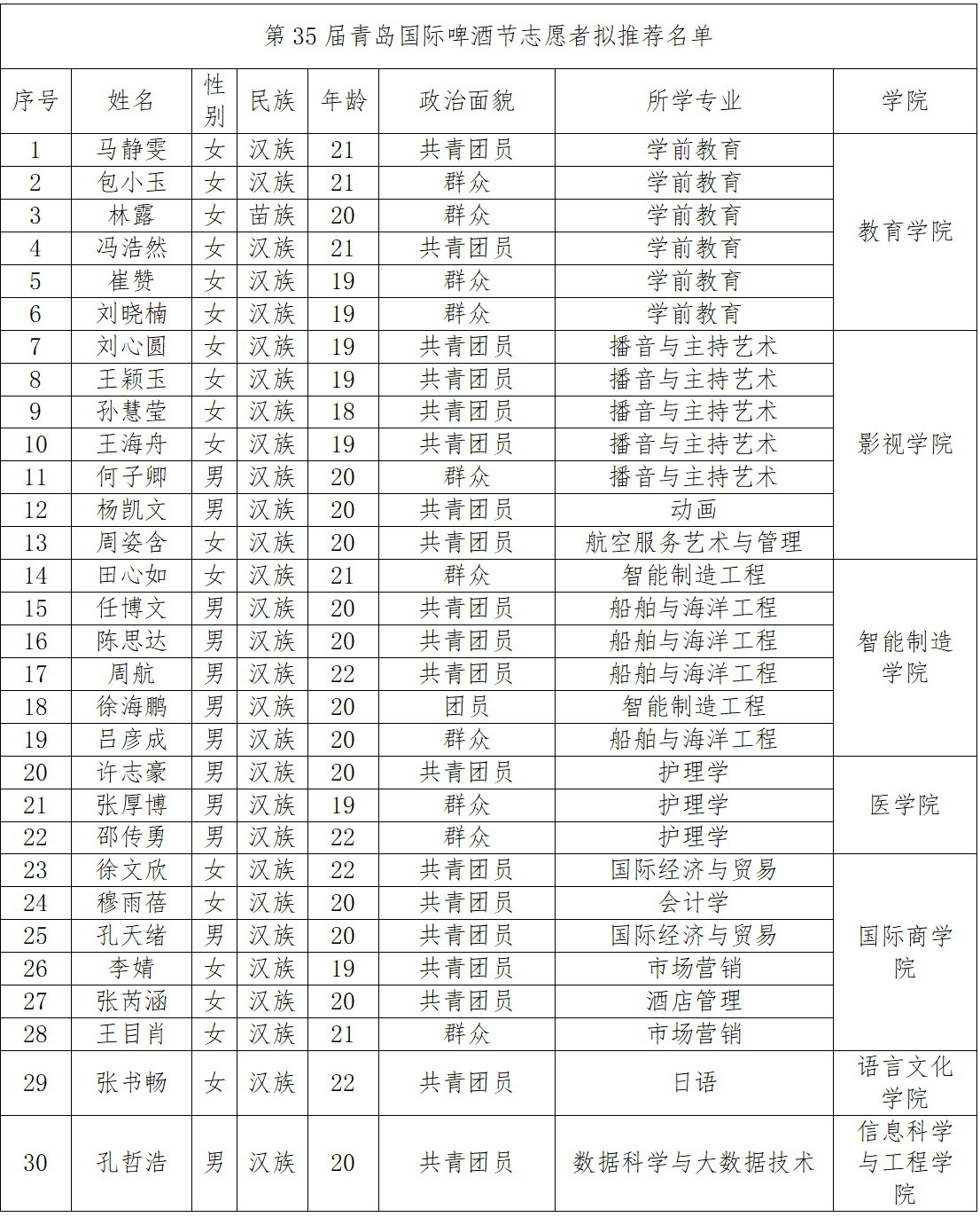 第35届青岛国际啤酒节将于7月18日至8月16日在金沙滩啤酒城举行,为确保第35届青岛国际啤酒节志愿服务工作规范高效、顺畅有序,积极践行“奉献、友爱、互助、进步”的志愿精神,根据《关于协助做好第35届青岛国际啤酒节志愿者招募工作的函》文件要求,经自愿报名、资格审查、学院推荐等环节,对候选人提交的材料进行初步审核,本着"公平、公正、公开"的原则进行面试,第35届青岛国际啤酒节志愿者拟推荐学生30名,从即日起予以公示,公示期3天。