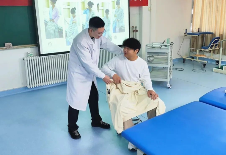 为了让同学们体验偏瘫患者充满困难的生活,刘一潇老师邀请一名学生扮演偏瘫“小李”,模拟偏瘫状态,进行穿衣训练。在模拟过程中,学生们亲眼目睹了“小李”在穿衣时遇到的种种挑战:由于一侧肢体功能受限,“小李”在尝试穿上衣物时,不仅动作显得异常艰难,还需要不断调整姿势、寻找平衡。尤其是穿袖子、扣纽扣等看似简单的动作,对于“小李”来说却是难上加难。这种直观的体验让学生们深刻感受到了偏瘫患者在日常生活中的不便和痛苦。