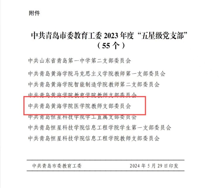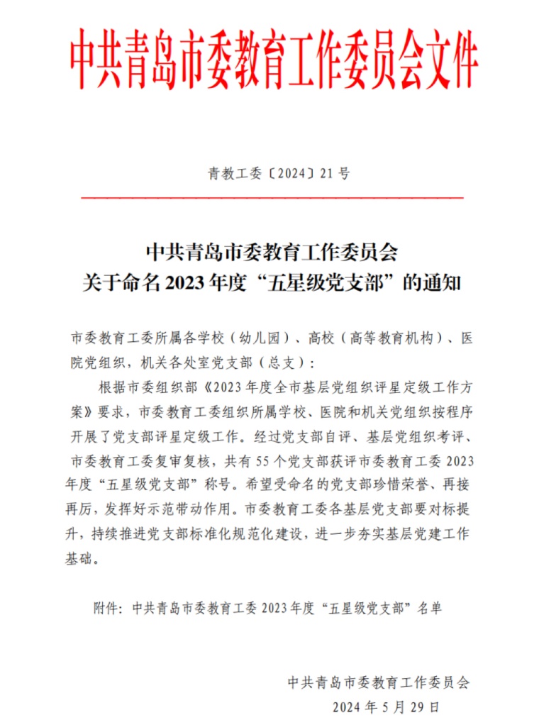 近日,中共青岛市委教育工委下发《关于命名2023年度“五星级党支部”的通知》,我院教师党支部获评2023年度“五星级党支部”荣誉称号。