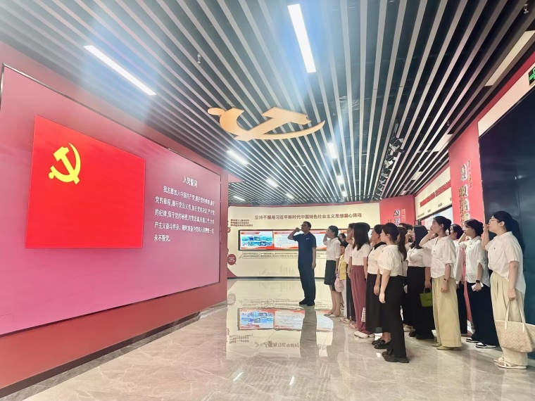 最后,孙延贺副书记还带领全体人员重温入党誓词。在铿锵有力的宣誓声中,此次参观学习进入尾声。本次活动,党总支以科技赋能党建,将“党建教育+5G高新视频技术+心理体验”创新融合,为寻访红色之旅带来沉浸式的体验,开辟了学院探索党建教育与科技创新深度融合新路径。它有效地促进了理论知识与实践体验的深度融合,显著增强了教职工党员的党性观念与使命感,为学院党建工作注入了新的活力与动力。参观党员同志纷纷表示,通过沉浸式的多媒体党建课程体验,让大家穿越时间和空间,能够身临其境的感悟革命精神,创新党建学习方式,在学习过程中对党的历史有了更深刻的认识和更深的感悟。