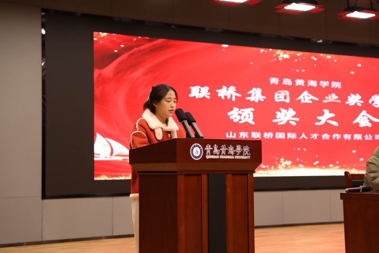 在颁奖结束后,一等奖获奖学生戚亚伟作为学生代表发言。她衷心感谢学校和企业给予的支持与鼓励,并分享了校企合作班提供的独特资源和机会对自己成长的重要性。戚亚伟同学表示,这份奖学金不仅仅是物质上的奖励,更是一种精神上的激励,将激励着自己和同学们在未来的学习和生活中继续努力。