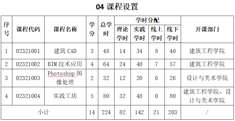 《BIM技术应用》和《建筑CAD》由建筑工程学院教学经验丰富的专业教师担任,《Photoshop图像处理》由设计与美术学院专业教师担任,《实践工坊》课程由建筑工程学院、设计与美术学院和实践经验丰富的企业专家共同指导完成。