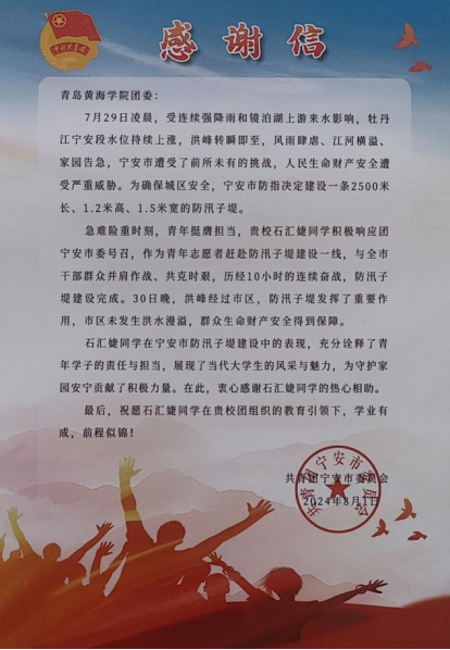 对于即将来临的开学季,市团委特此给石汇婕同学发来了感谢信,接到感谢信时,石汇婕同学表示这封感谢信就像是洪流中的一缕光,照亮了我前行的方向。让我更加坚定未来的路该怎么走,感谢信如春风拂面,温暖了我的心房,让我深知,每一份付出都闪耀着不凡的光芒。