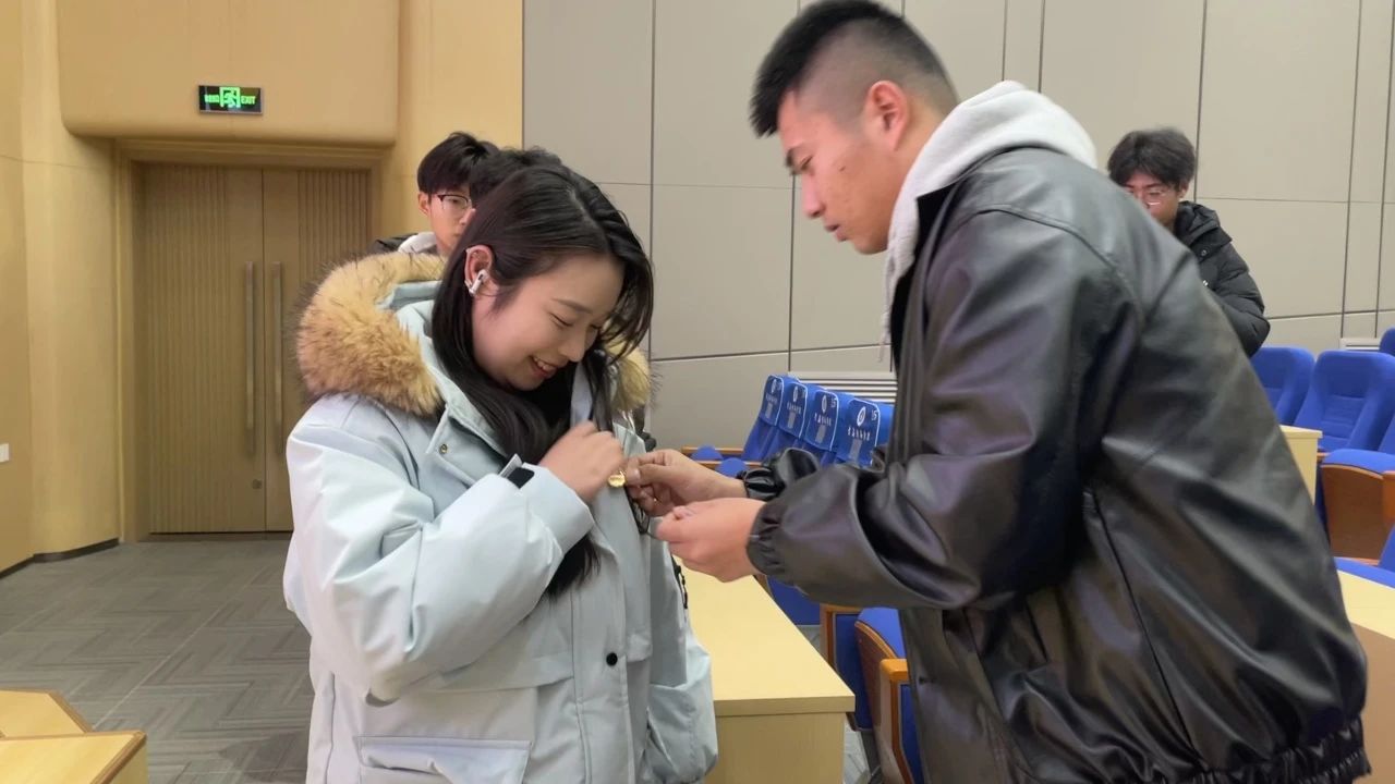 而最具仪式感的,莫过于团徽的颁发与佩戴环节。朱升学老师面带微笑,将一枚枚闪耀着光芒的团徽递到新团员手中,并亲手为他们佩戴。团徽在新团员的胸前熠熠生辉,这小小的徽章,承载着无上的光荣与重大的责任,它是共青团员身份的象征,是对新团员的激励与鞭策。