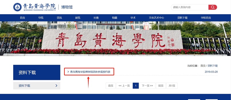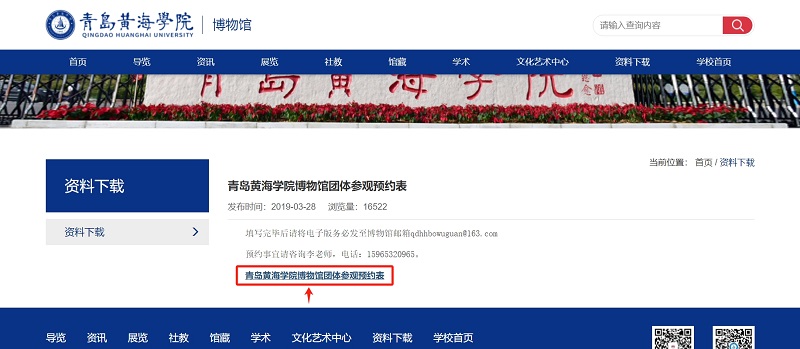 您可以登录800cc全讯白菜网主站博物馆官方网站(https://zsb.qdhhc.edu.cn/mb/1/Index.aspx?wsId=41),按照下列步骤下载并填写博物馆团体参观预约表。