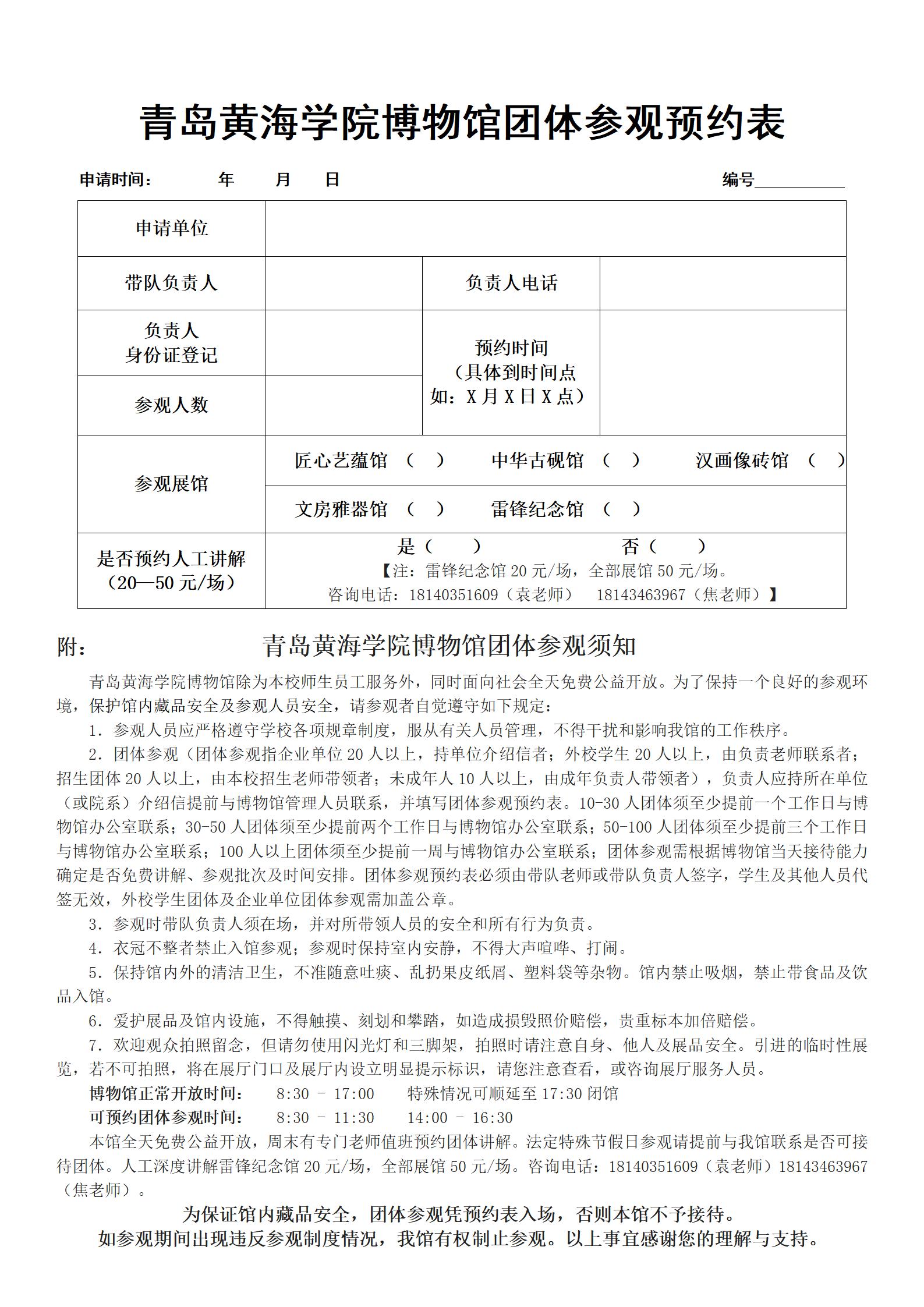 请务必提前3天预约。填写好预约表后,将其发送至博物馆邮箱(qdhhbowuguan@163.com),待工作人员跟您确认后,携带打印好的预约表即可前来博物馆参观。