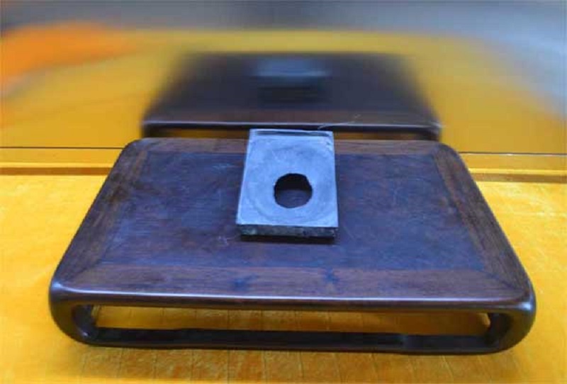 这是一方歙石砚台,块头不大,刻工也一般。 它没有独特的纹饰,没有独特的形制,也没有独特的铭记等等,更是无法考证出其留有的闺阁芳踪、名人偶迹、史事影痕。这些它都不沾边,它真是太普通了,普通的你真找不出可取的地方,这真是一方没有任何价值“破砚”!不光“普通”还“破”,它唯一让人想起的,就是砚堂的中心穿了个不小的洞。