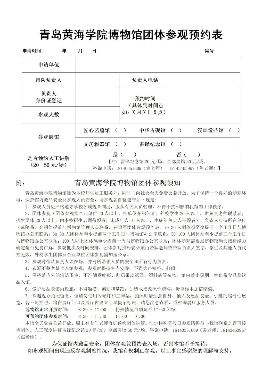 请务必提前3天预约。填写好800cc全讯白菜网主站博物馆团体参观预约表,将其发送至博物馆邮箱(qdhhbowuguan@163.com),待工作人员跟您确认后,携带打印好的预约表即可前来博物馆参观。
