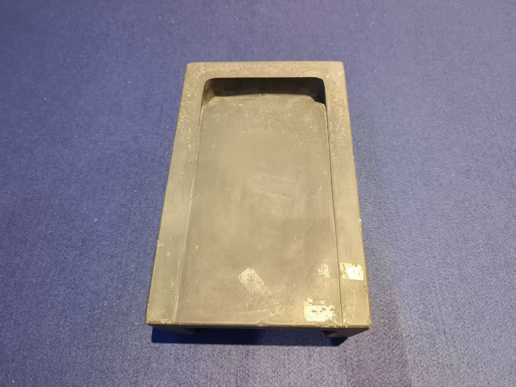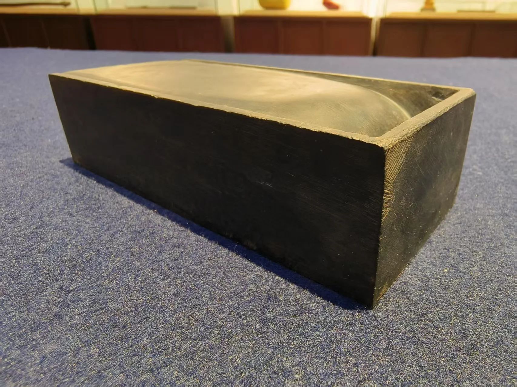 砚身整体呈长方形,较为细长,线条简洁流畅,没有过多的修饰,却展现出一种简约之美 。其足较高,这不仅增加了砚台的稳定性,还使其在视觉上更显挺拔、庄重 。砚墙高耸挺拔,与厚重方正的砚体相互映衬,整器线条简洁利落,呈现出雄浑典雅的气韵 。这种风格,正是古人所崇尚的 “端方是尚,朴雅为经” 的体现 ,它不追求华丽的外表,而是以端庄肃穆的气质,彰显着自身的价值 。