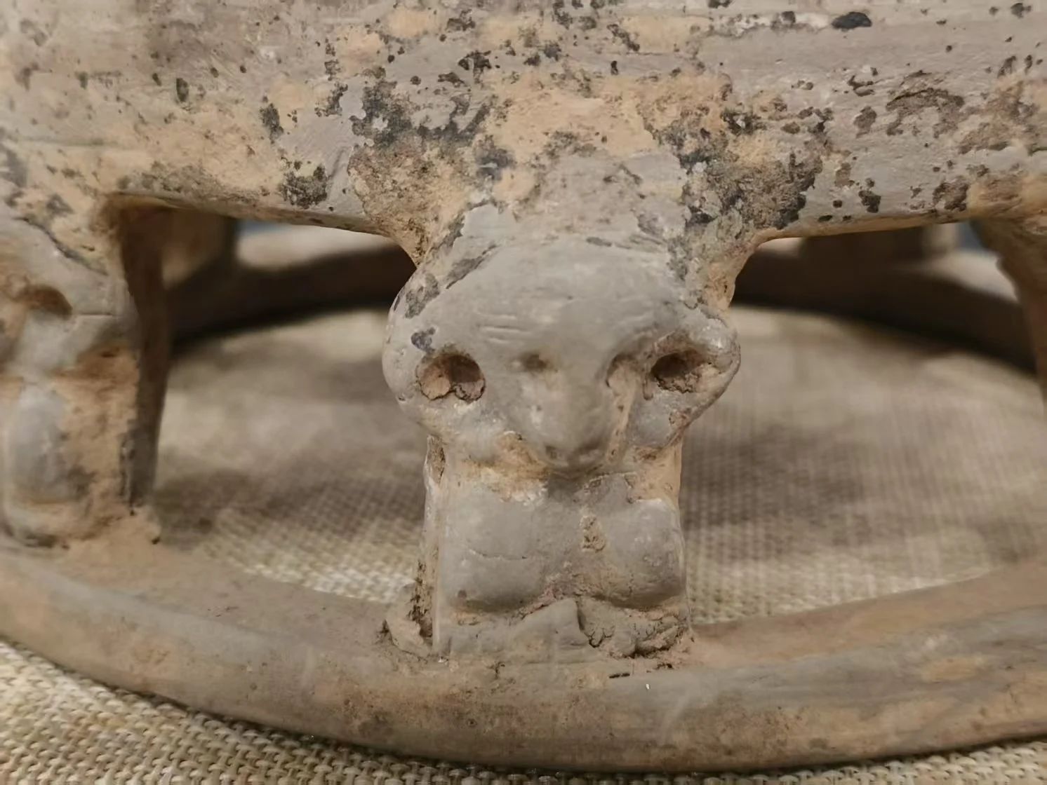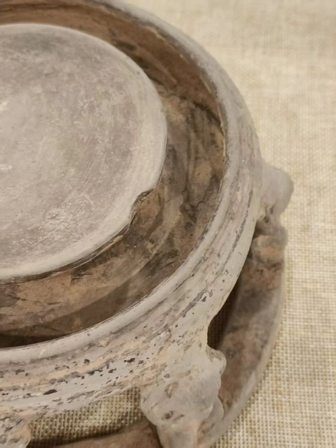 这方辟雍砚由灰陶制成,散发着古朴而温润的气息。砚台整体呈圆形,底部有八只“蹲式猴足”,造型生动活泼,充满了灵动感。每一只“猴足”都雕琢得细腻入微,猴子的神态憨态可掬,仿佛随时都会跳跃起来。这些“猴足”不仅为砚台提供了稳定的支撑,更增添了几分独特的艺术魅力。
