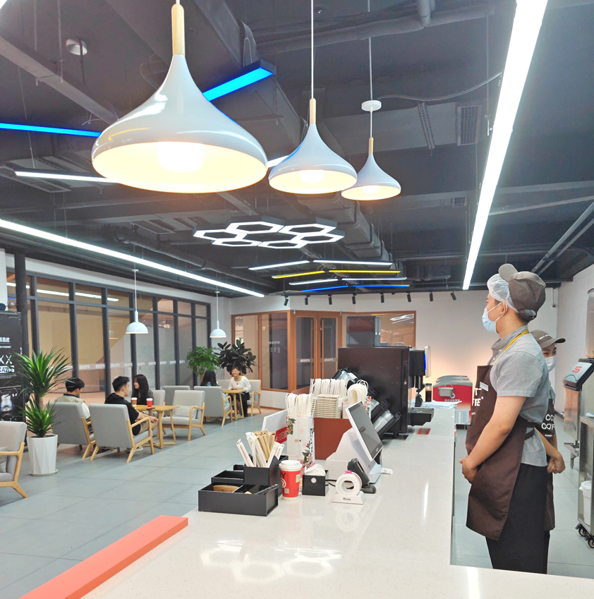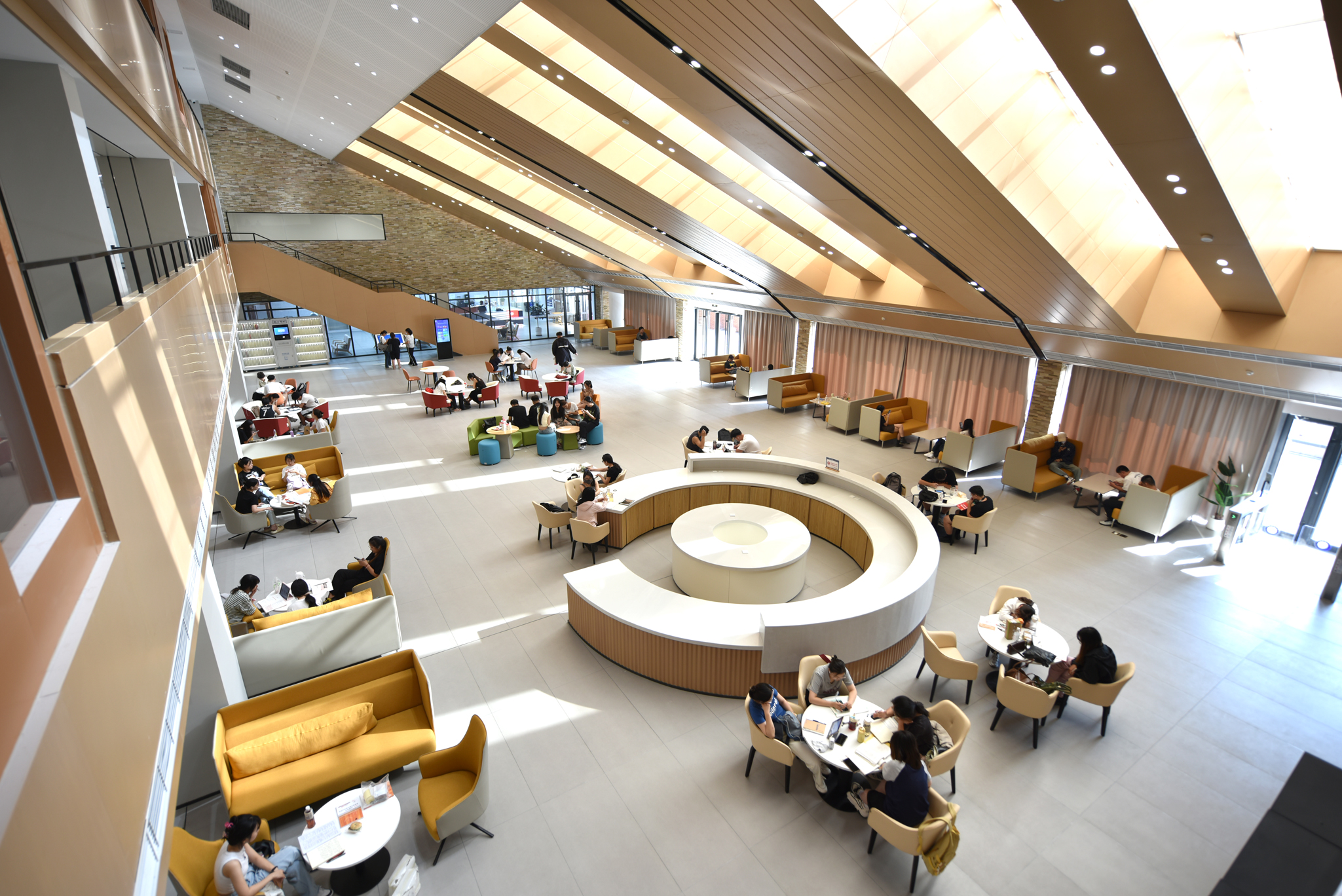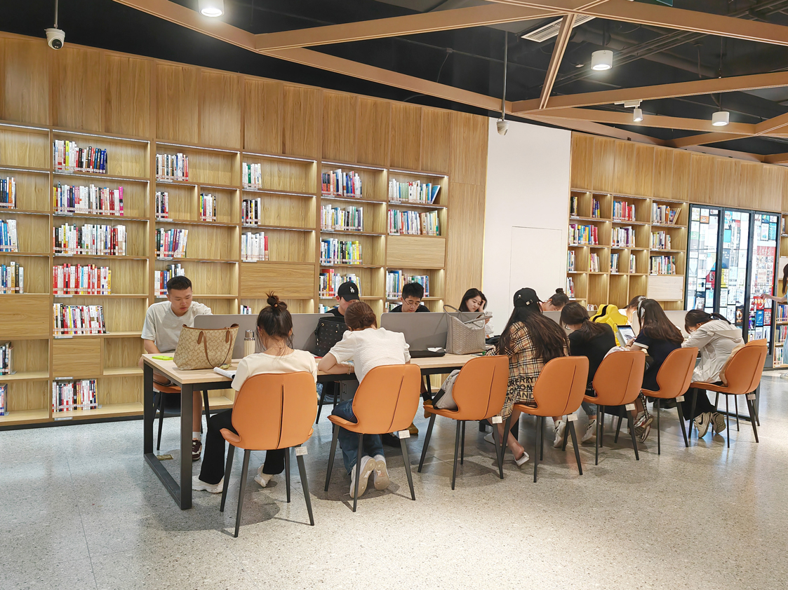 “阅享空间”位于西区18-21号宿舍楼之间,该区域是集图书阅览、学习交流、学生一站式服务、运动健身、心理辅导、休闲娱乐、餐饮购物等多功能于一体的多元集合空间,充分满足师生个性化、多样化的学习生活需求。学校充分发挥环境育人作用,从师生实际需求出发,将绿色环保、人文关怀、艺术审美、智慧化管理与服务的发展理念融入“阅享空间”的每一个角落,营造独具特色的校园文化风格,实现功能性、人文性、艺术性相统一。书桌上配有电源插口、USB接口和触摸灯开关。灯光可根据读者需求自行调节亮度,智能感应、光度柔和、没有阴影,带给读者最舒适、安心的学习和阅读体验。“阅享空间”配备咖啡屋、便利店、书屋、健身房等, 赋能“悦读”新体验。浓郁的咖啡香味,搭配各类赏心悦目的美食,书香氤氲,使阅读和学习成为一件快乐幸福的事情。
