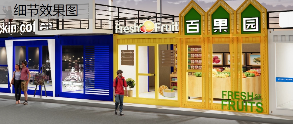 方案二整体造型前后错落富有张力,利用部分装饰造型和二层悬挑空间,体现街区活力丰富的涂装立面,表达出大学生活的青春动感。