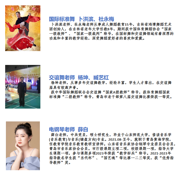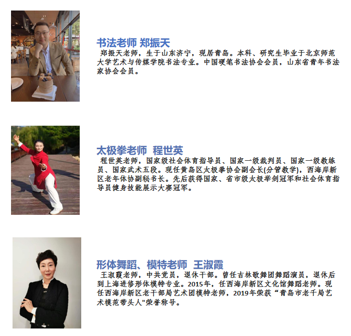 1.书法-进阶班、篆刻、欢唱声乐、葫芦丝、朗诵、形体舞蹈、中医经络养生、太极拳、交谊舞、手机摄影、国画、国际标准舞、声乐、书法-基础班、形体模特460元/学年,乒乓球480元/学年,瑜伽、电钢琴580元/学年。
