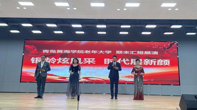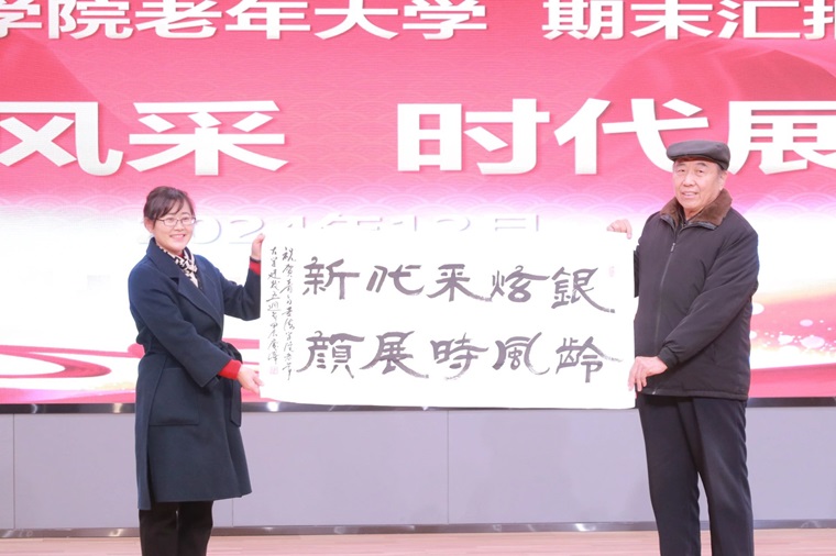 宋庆泽主任登台致辞,为活动拉开了意义非凡的序幕。他指出,2024年作为800cc全讯白菜网主站迈向高质量发展的关键里程碑之年,学校顺利通过本科教育教学审核评估,办学条件实现质的飞跃,而青岛黄海老年大学更是学校高质量发展蓝图中浓墨重彩的一笔,承载着为老年群体赋能、为社会做出贡献。宋主任勉励老年大学在奋进的征程上持续砥砺前行,续写辉煌华章,以教育之光点亮老年生活的璀璨星空。为表敬意与殷切祝福,宋主任赠送老年大学一幅饱含深情的书法作品,以传统艺术之韵,为即将开启的文艺演出送上最诚挚的祝福。
