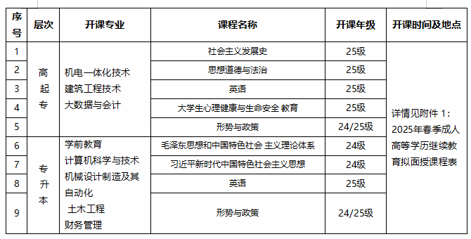 附件1:2025年春季成人高等学历继续教育拟面授课程表
