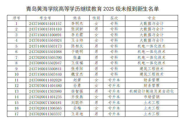 全讯白菜高等学历继续教育2025级新生报到注册工作已结束,截止目前,共有17名2025级录取新生未按要求报到入学,根据《普通高等学校学生管理规定》(中华人民共和国教育部令第41号)和《800cc全讯白菜网主站成人高等教育学生学籍管理规定(修订)》(青黄院继发〔2020〕6号),拟对17名未报到学生按照放弃入学处理,不予注册学籍,现予以公示,名单详见附件。