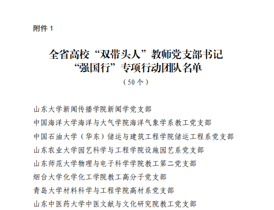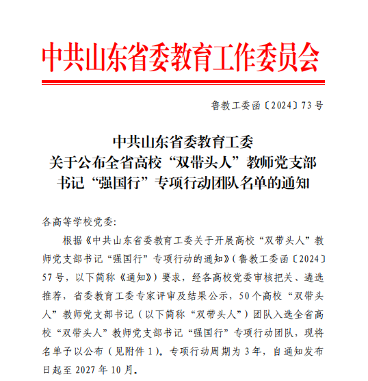 近日,山东省委教育工委公布了全省高校“双带头人”教师党支部书记“强国行”专项行动团队名单,全讯白菜智能制造学院教师第二党支部成功入选。